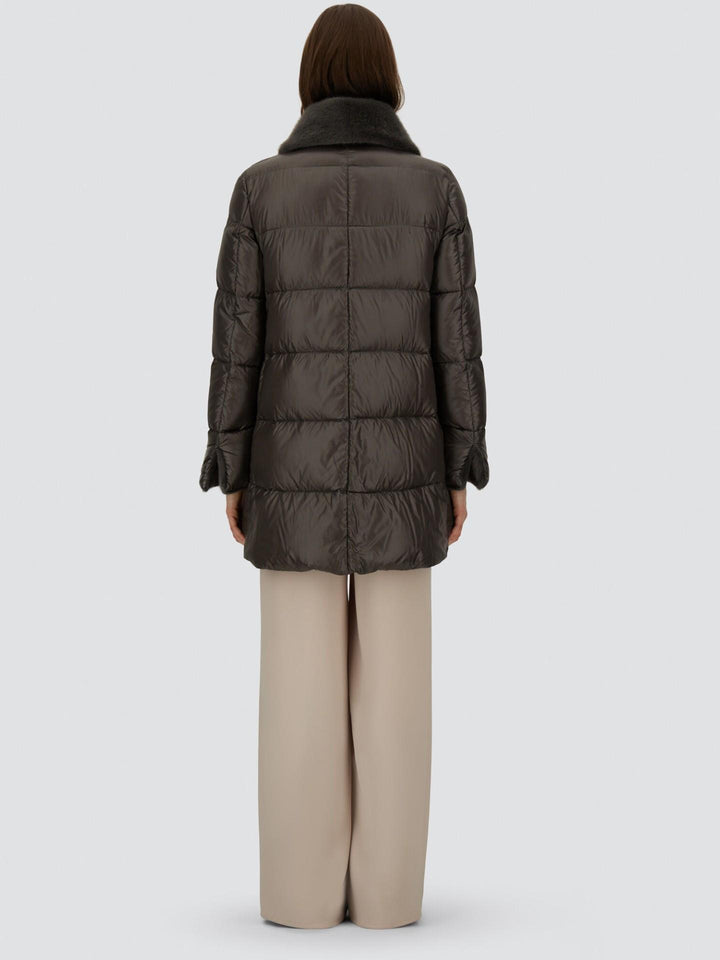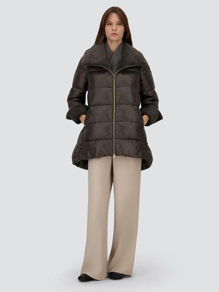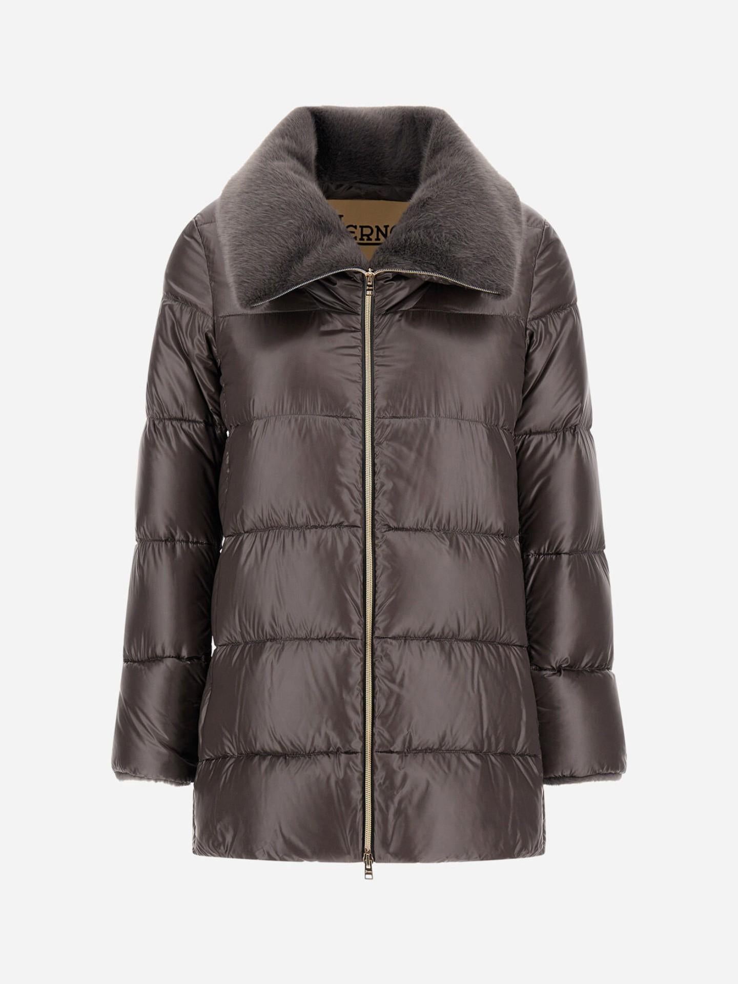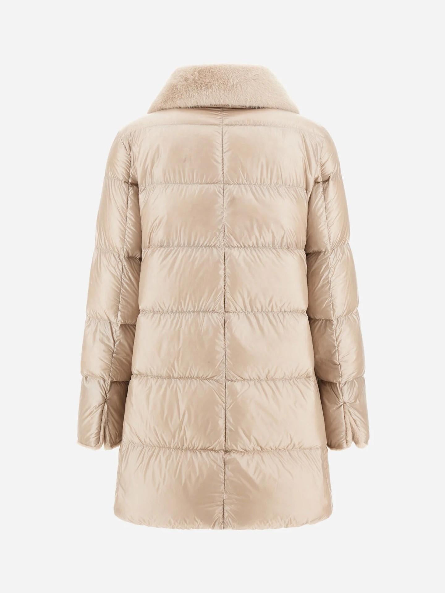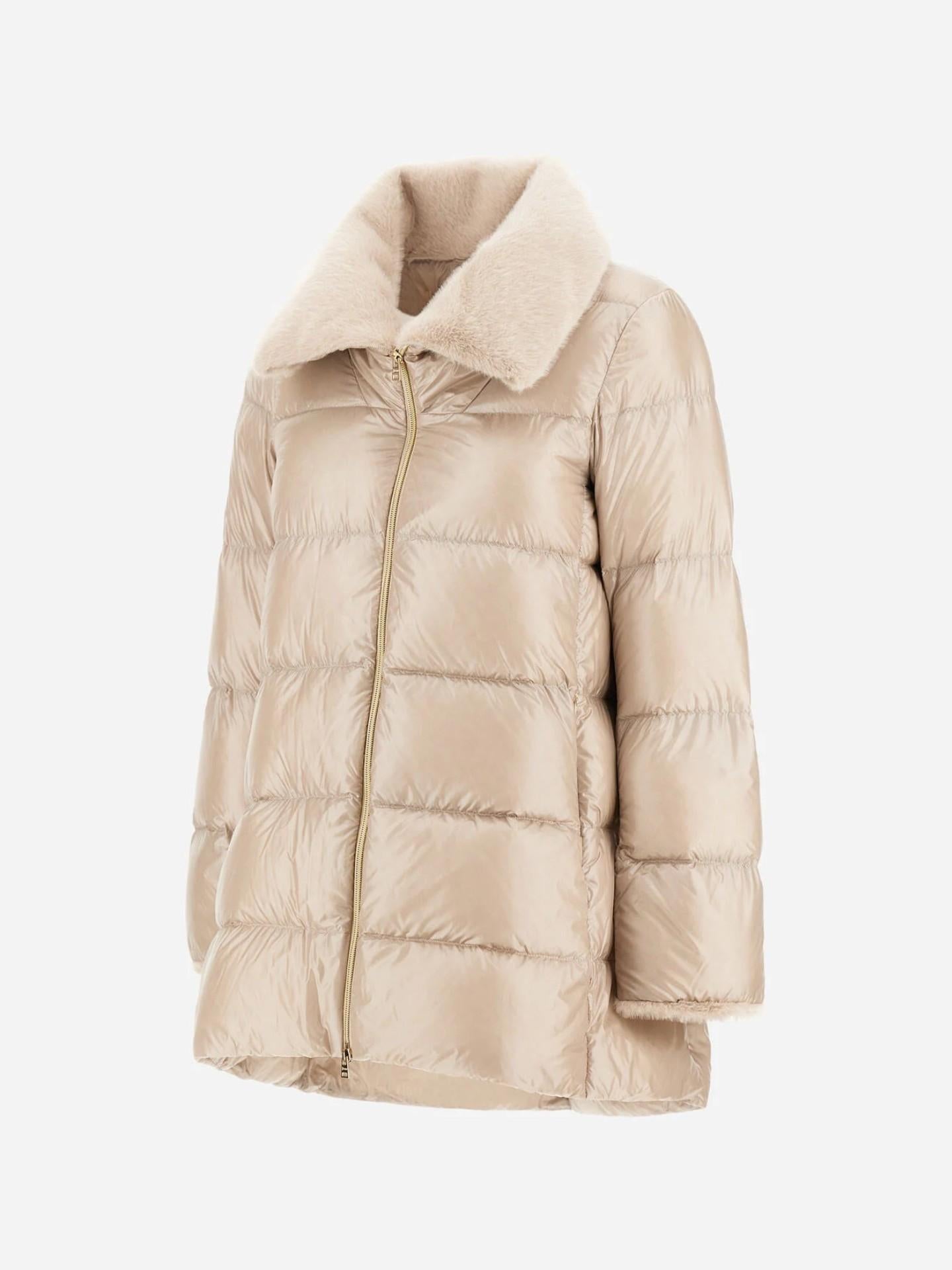 En elegant jacka från Herno i den klassiska A-silhuetten, tillverkad i varumärkets ikoniska ultralätta nylon. Den exklusiva japanska 20-deniertekniken och den fina dunfyllningen ger en mjuk, lätt och värmande känsla. Den höga kragen är klädd i lyxig fuskpäls med len, klippt yta som tillför en sofistikerad kontrast. Ett tidlöst ytterplagg som kombinerar italienskt hantverk, funktion och feminin elegans.