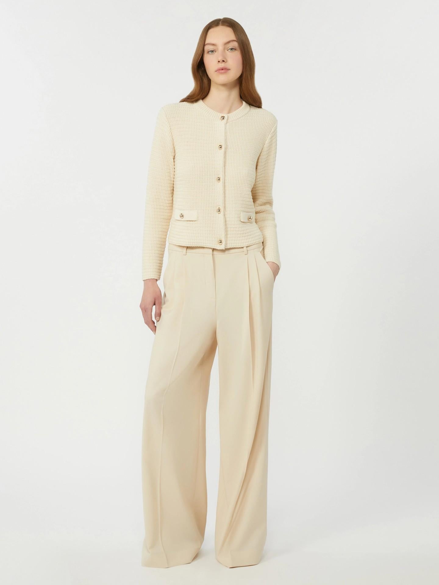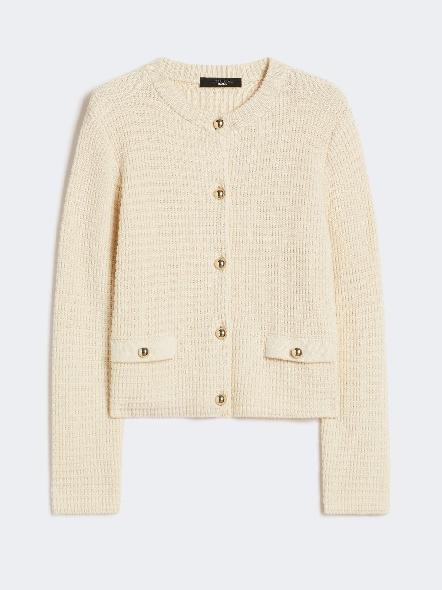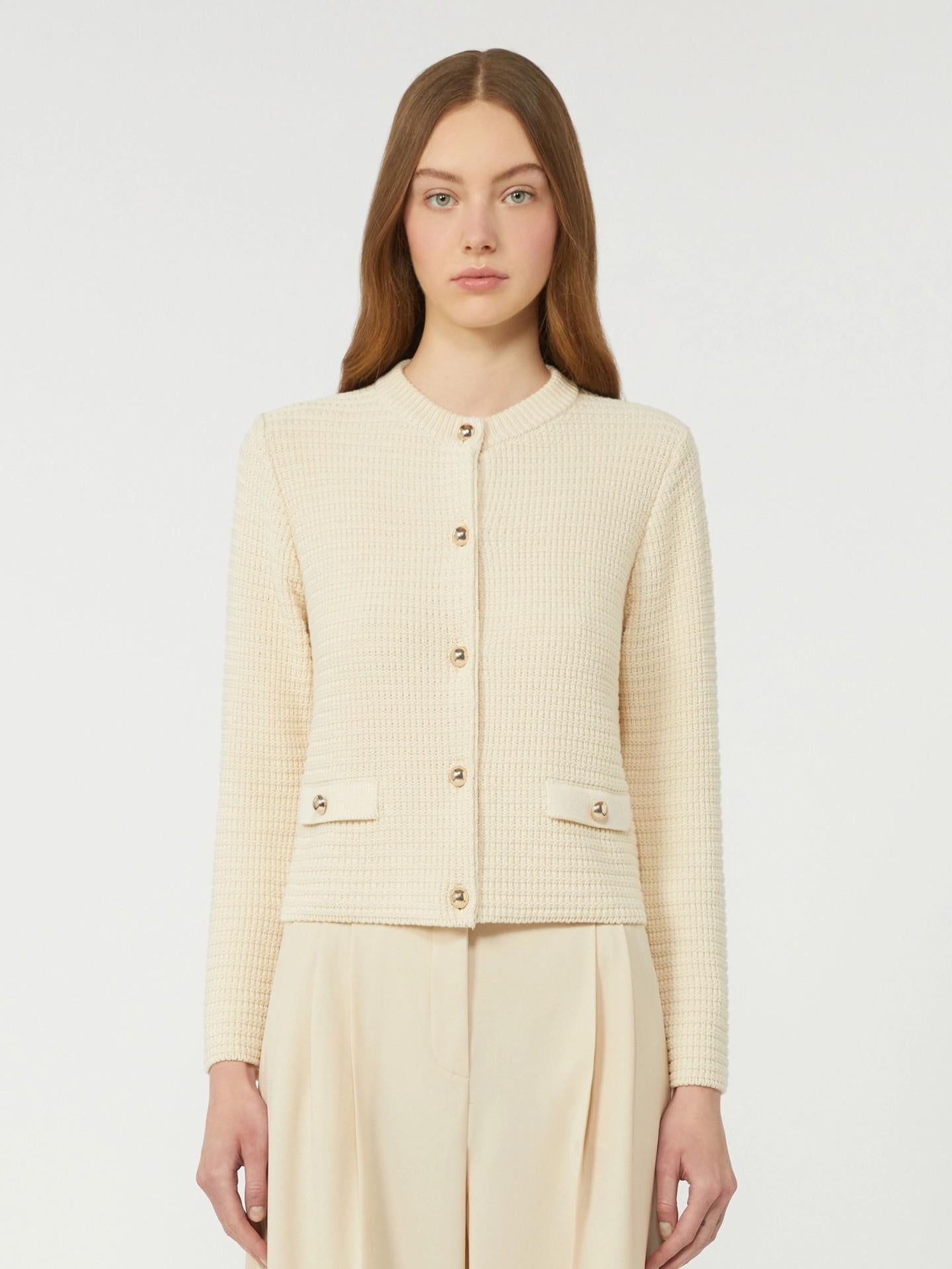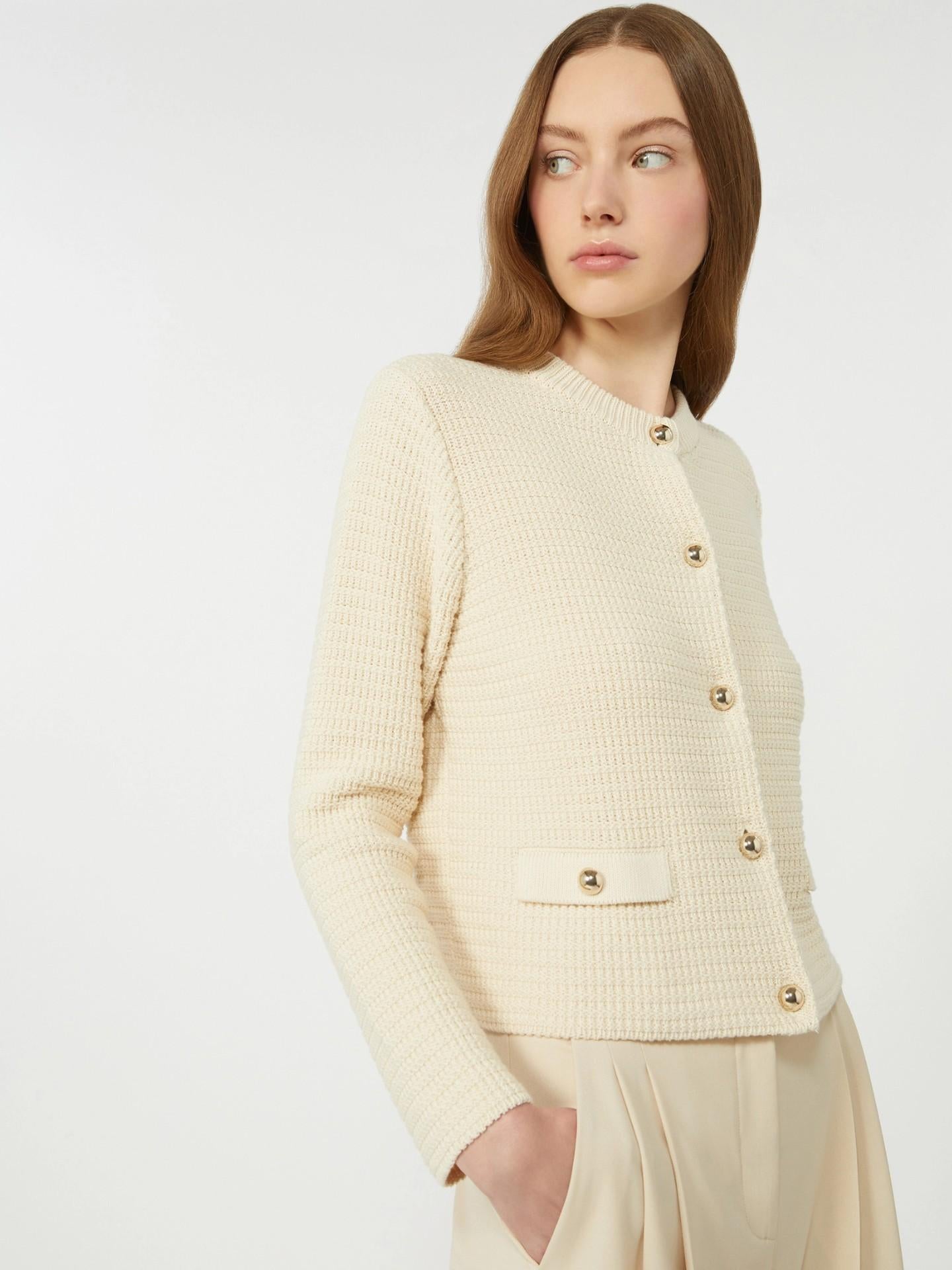 A cropped knitted cardigan from Max Mara in a cotton blend with a structured link knit. The straight, slightly boxy silhouette is combined with metal buttons and decorative pocket details for a modern yet timeless look. A perfect layer over a dress, top or shirt.