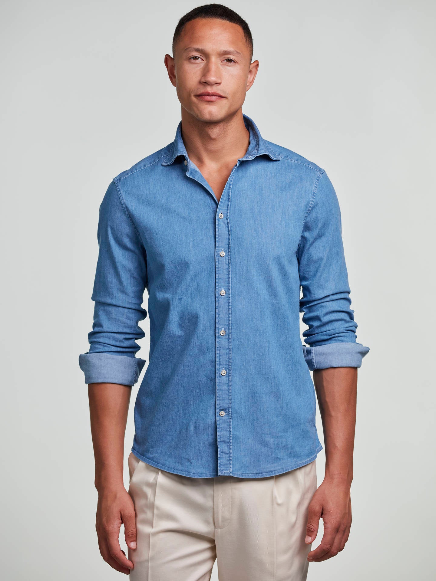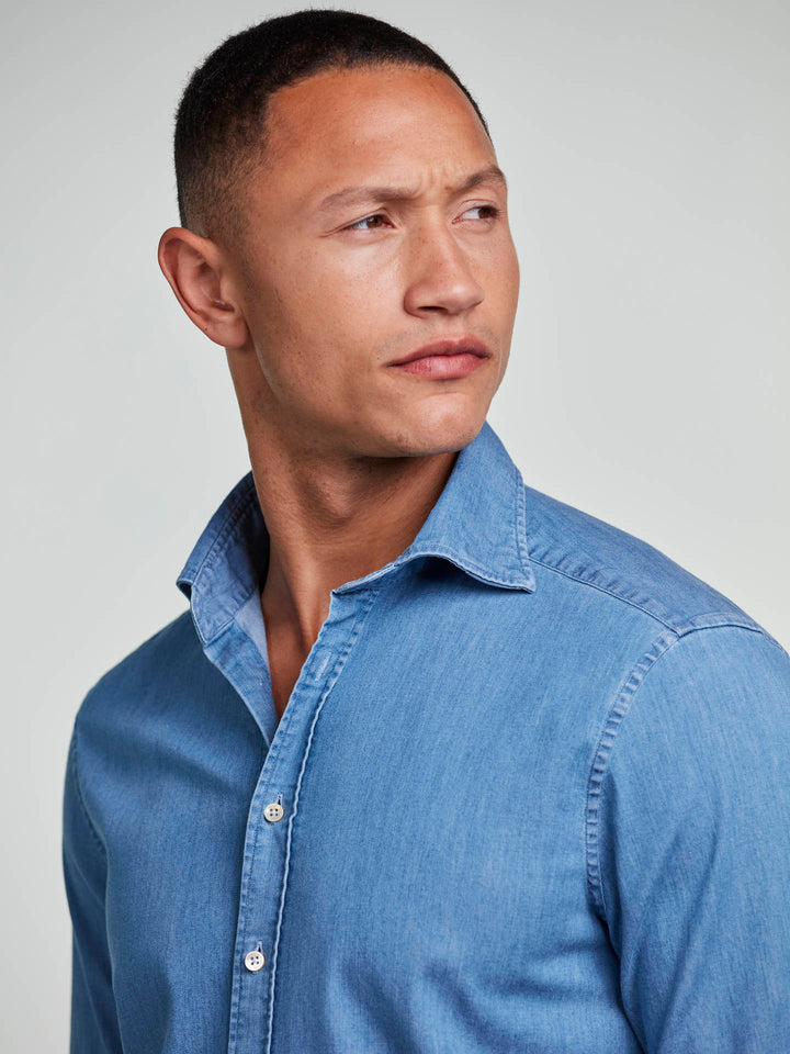 Denim shirt from Stenströms in regular fit. Made of cotton with a small amount of elastane for extra comfort. The shirt has a semi cut away collar, single cuffs and mother-of-pearl buttons. Washed finish that gives a relaxed but stylish feel - perfect for both everyday and office wear and only gets better with time!