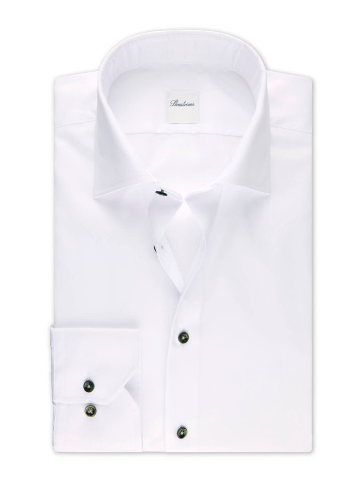 En klassisk vit twillskjorta från Stenströms, tillverkad i exklusiv Twofold-bomull som ger en mjuk, följsam och slitstark kvalitet. Modellen är utrustad med Moderate Cut Away-krage No. 77 och enkla manschetter. Det som verkligen lyfter skjortan är de mörkgröna pärlemorknapparna, som skapar en sofistikerad kontrast mot det vita tyget. En elegant och mångsidig skjorta som passar lika bra till vardag som till mer formella tillfällen.