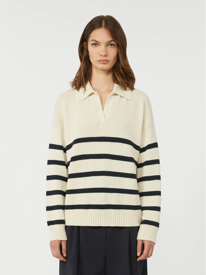 A relaxed knit jumper in a soft cotton blend with a smooth knit surface and a flowing fit. The open polo collar and dropped shoulders give a relaxed yet well-balanced look, while ribbed details frame the silhouette. A versatile everyday piece that works equally well with jeans or more tailored trousers.
