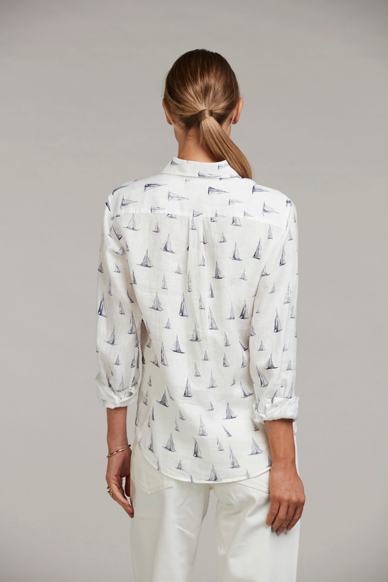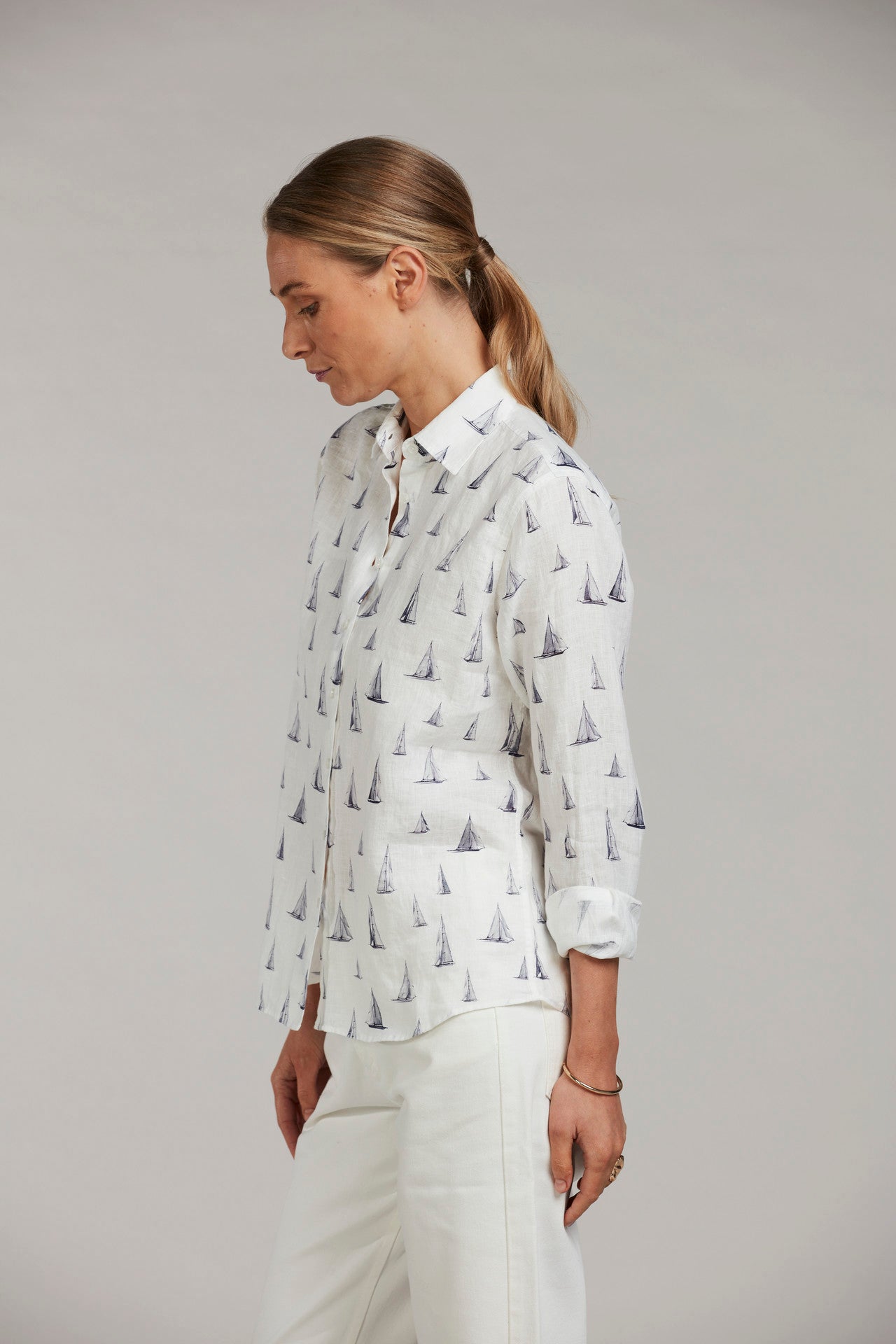 Siri is a patterned linen shirt in 100% linen with a relaxed silhouette and a playful sailboat motif. The natural structure of the linen gives the garment a soft and airy fall, perfect for warmer days. The casual fit makes the shirt easy to wear both loose and tucked in, while the maritime pattern adds personality without taking over. A summery shirt that goes just as well with linen trousers as with denim or shorts.