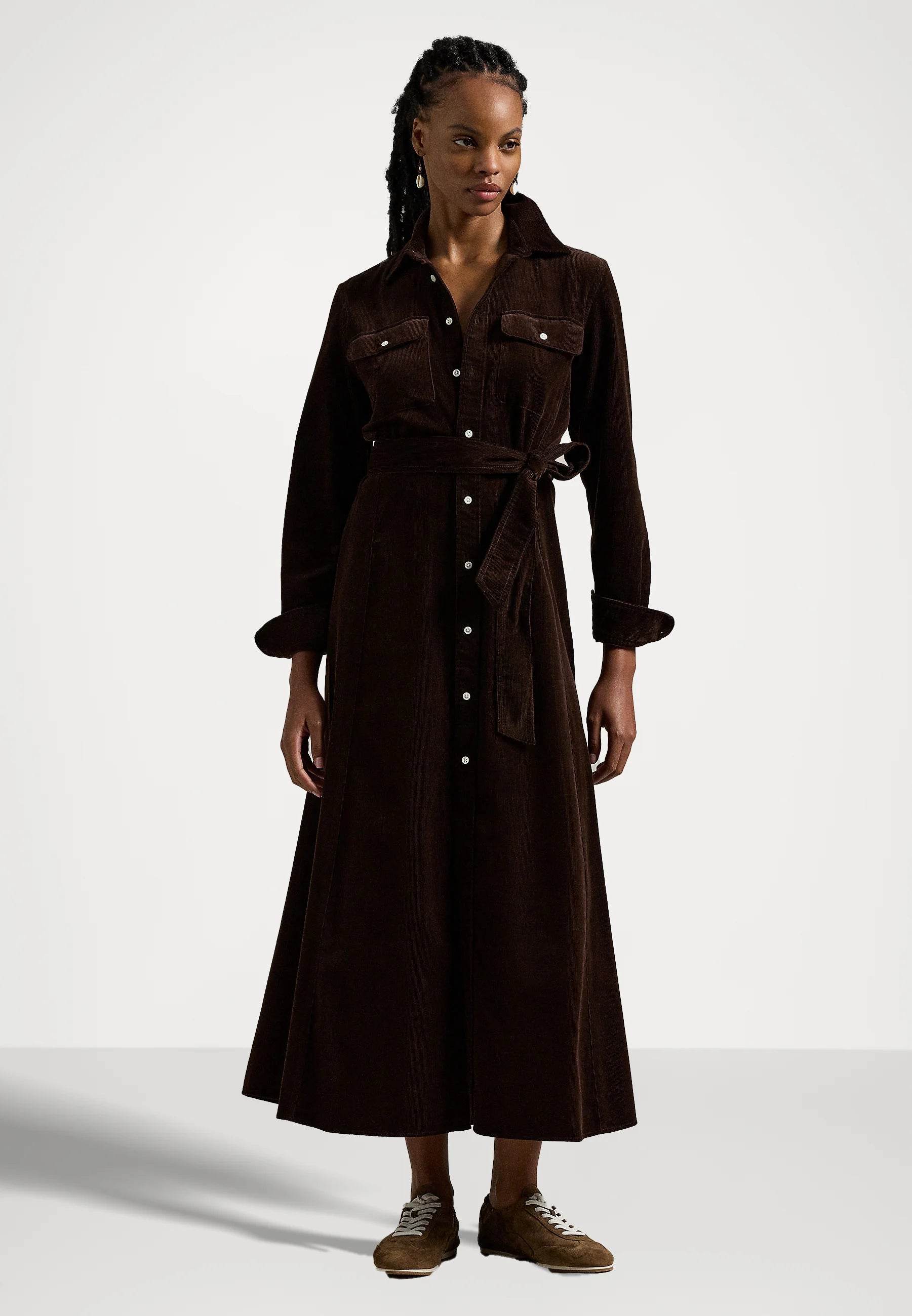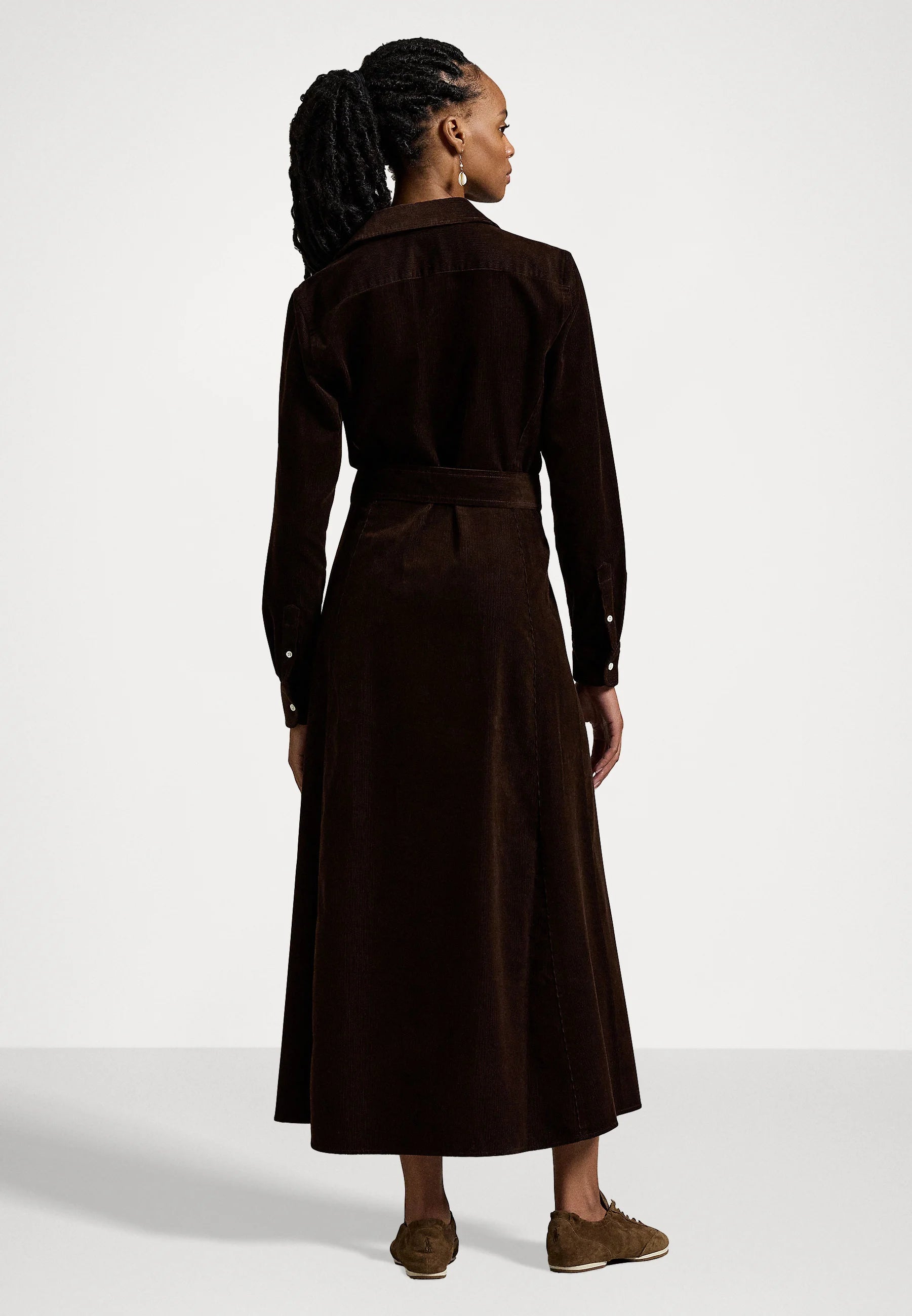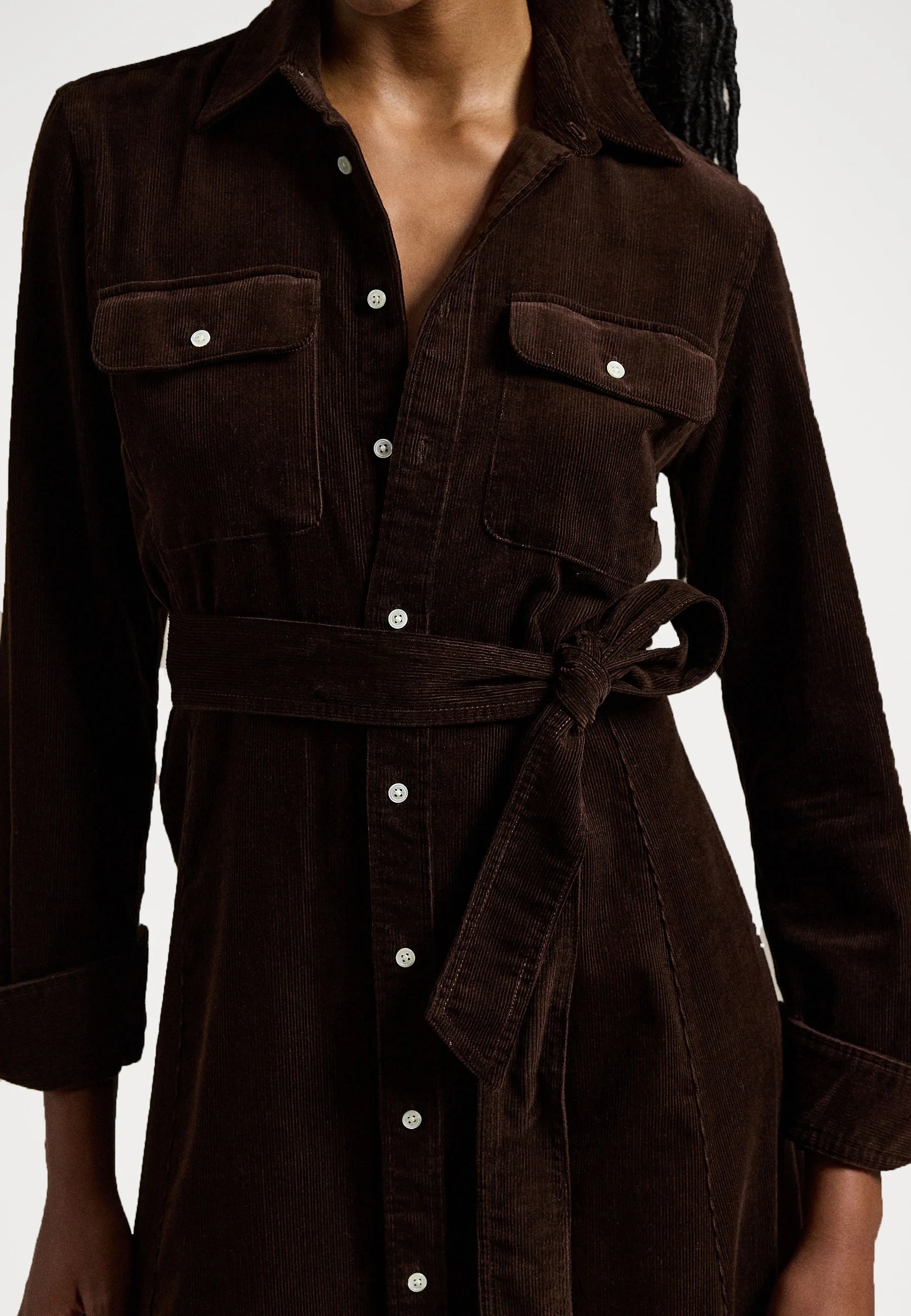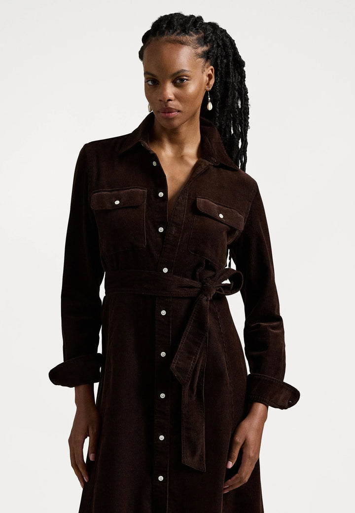 An elegant shirt dress from Polo Ralph Lauren made from soft, finely ribbed cotton corduroy with a beautiful drape. The A-line silhouette is enhanced by princess seams that create a feminine and flattering shape, while the removable belt makes it easy to vary the expression. A versatile dress that works equally well for everyday wear as for more dressed-up occasions.
