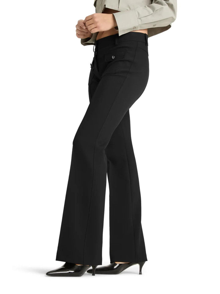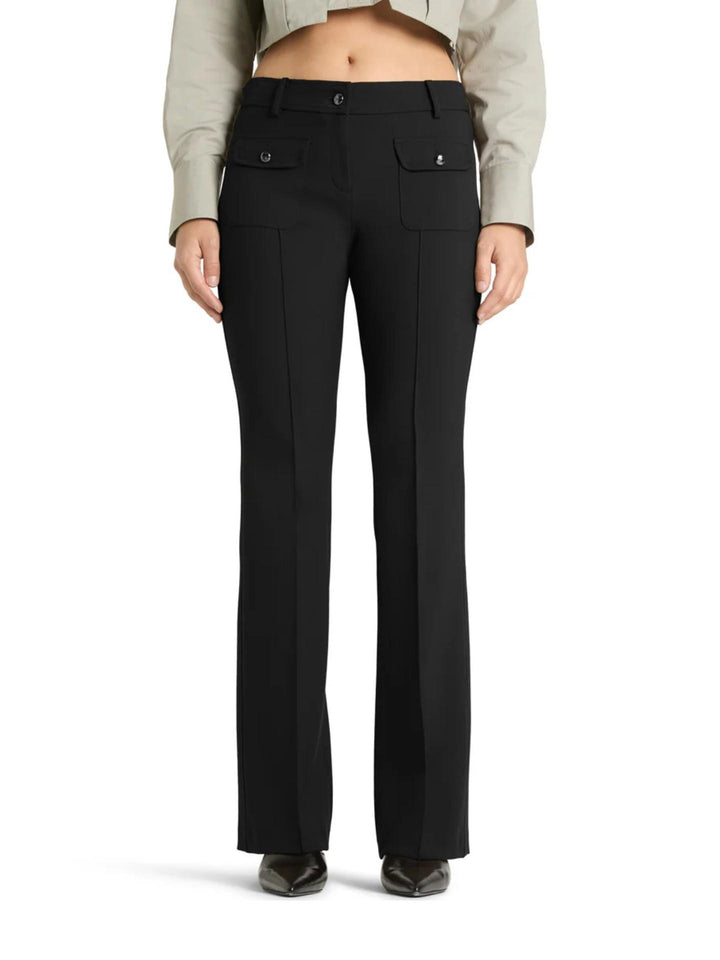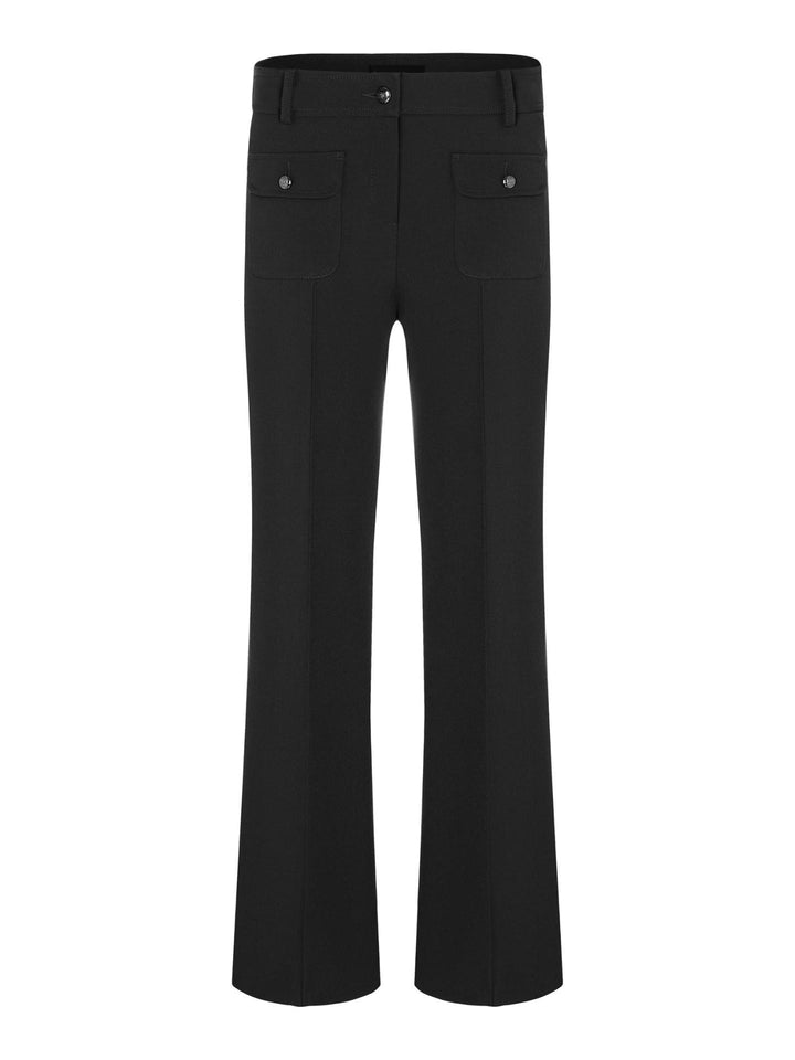 Modellen Farah har fått en modern tolkning av det klassiska designuttrycket, med dekorativa silvriga knappar och påsydda fickor som tillför en sofistikerad detalj. Den följsamma bi-stretchkvaliteten ger en mjuk känsla och hög komfort – perfekt för långa dagar med stil och rörelsefrihet.