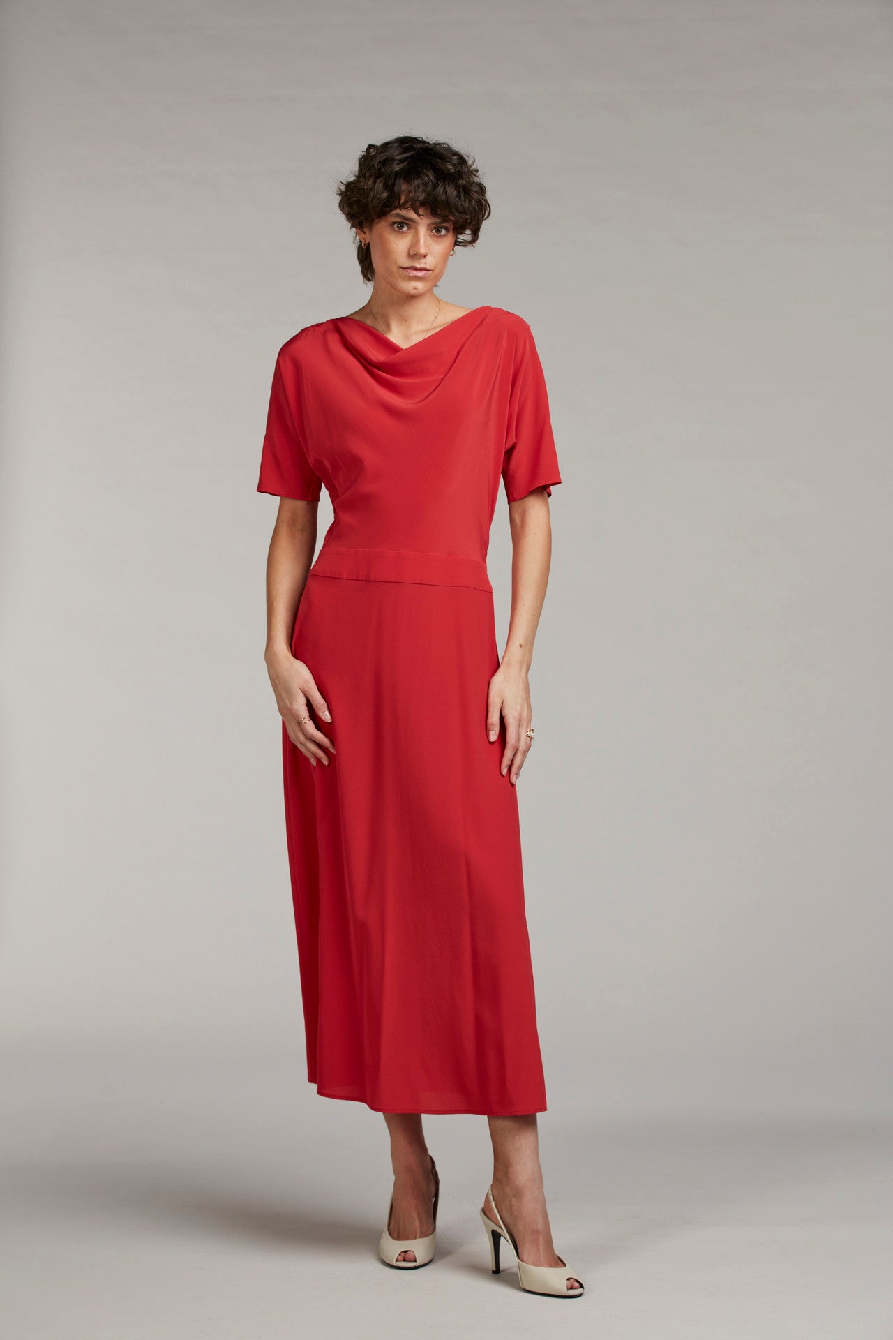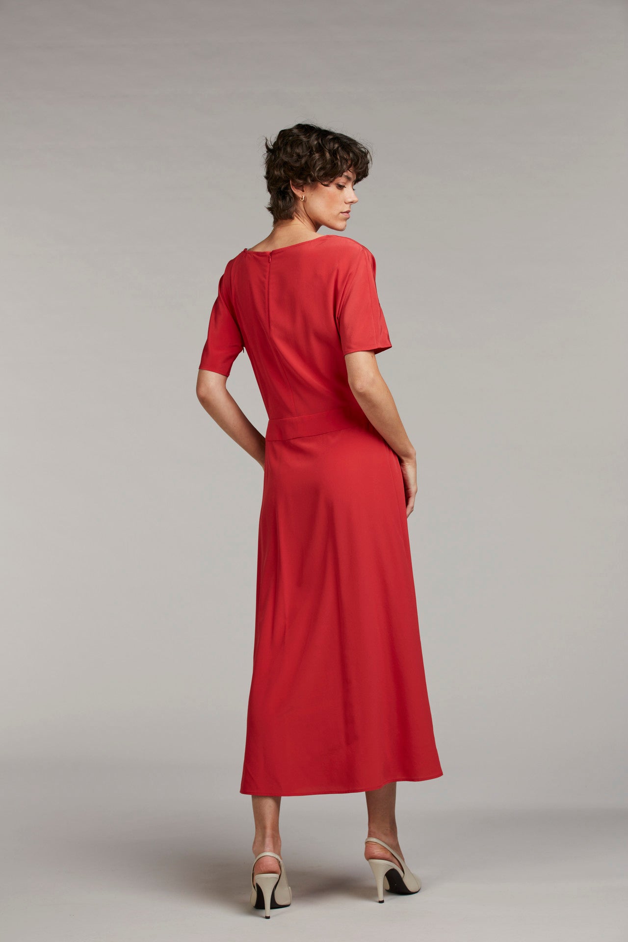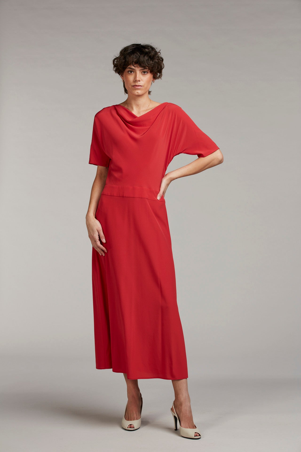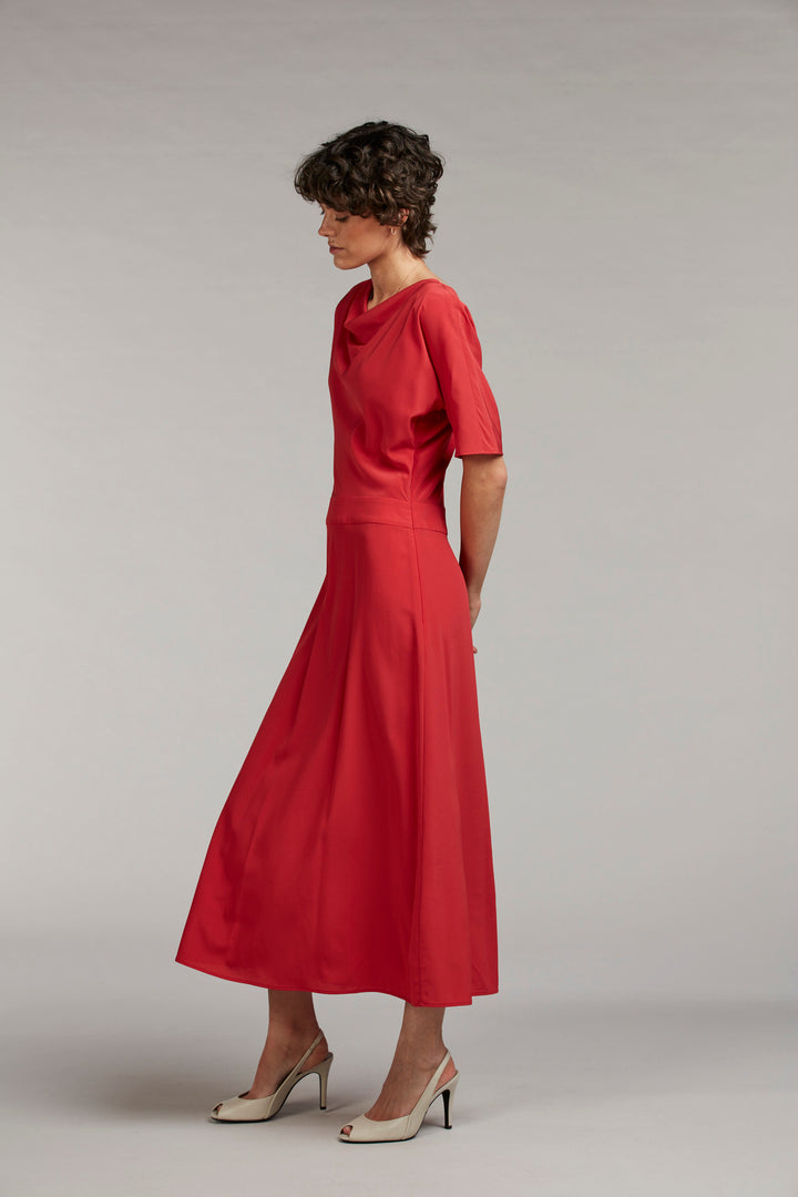 Jessa är en elegant sidenklänning i en klar ljusröd ton med ett mjukt, levande fall. Den draperade vattenfallsringningen ger ett sofistikerat uttryck och skapar rörelse upptill, medan den smala siluetten markerar figuren på ett balanserat sätt. Materialet i 97% silke med en liten andel elastan ger både lyster och komfort. Den släta ytan fångar ljuset subtilt och gör klänningen lika självklar till sommarens tillställningar som till mer formella kvällar. Bär den med minimalistiska accessoarer för ett rent uttryck – eller låt färgen ta huvudrollen.