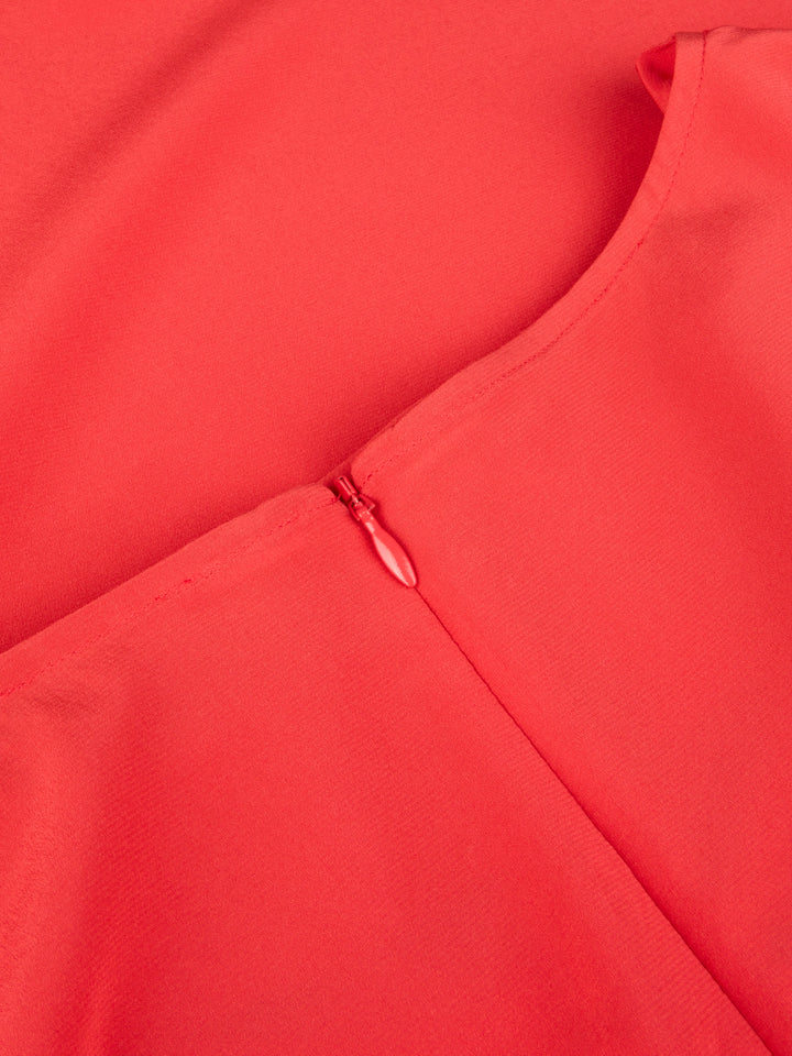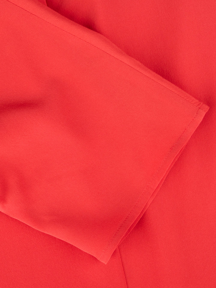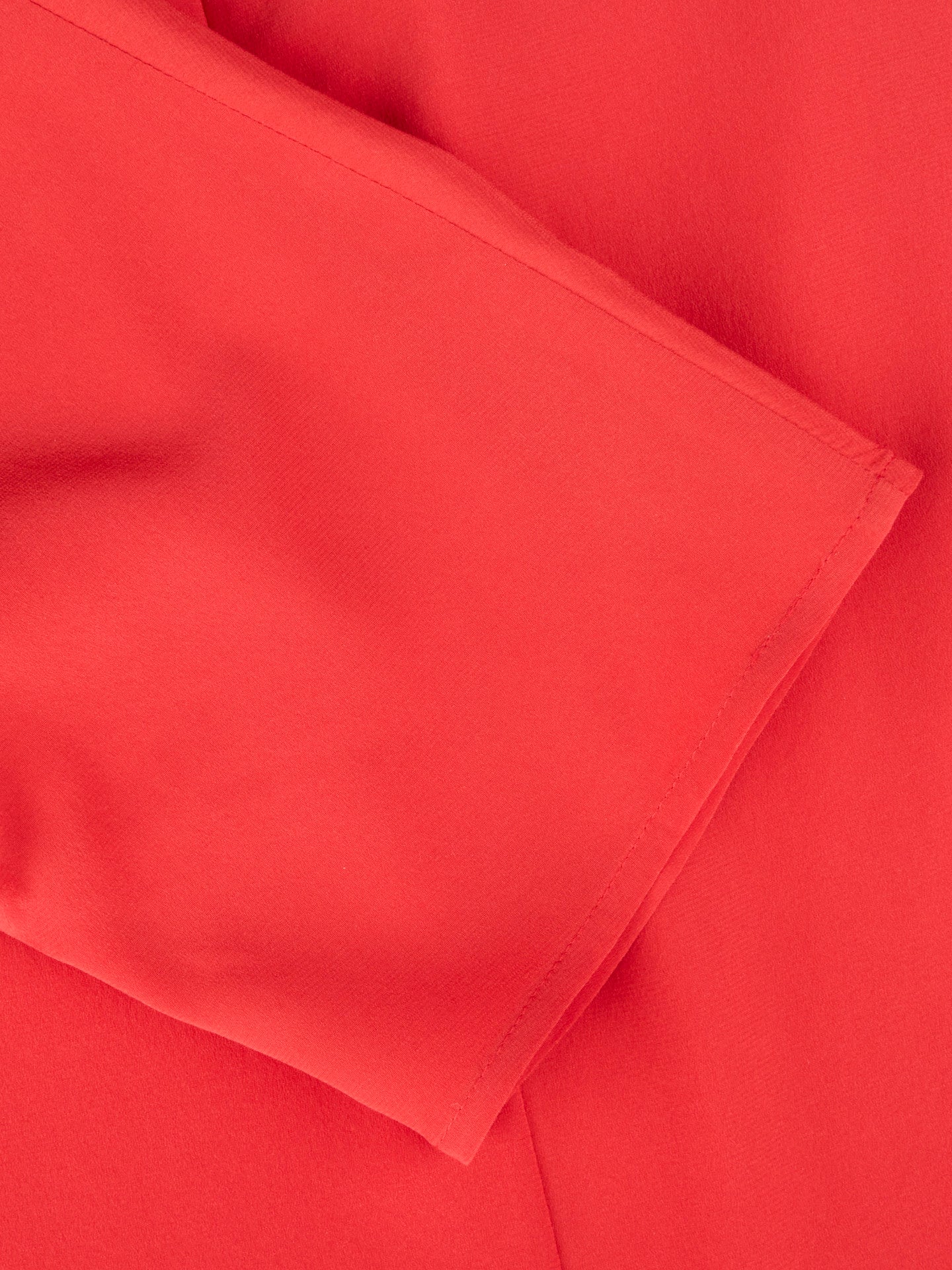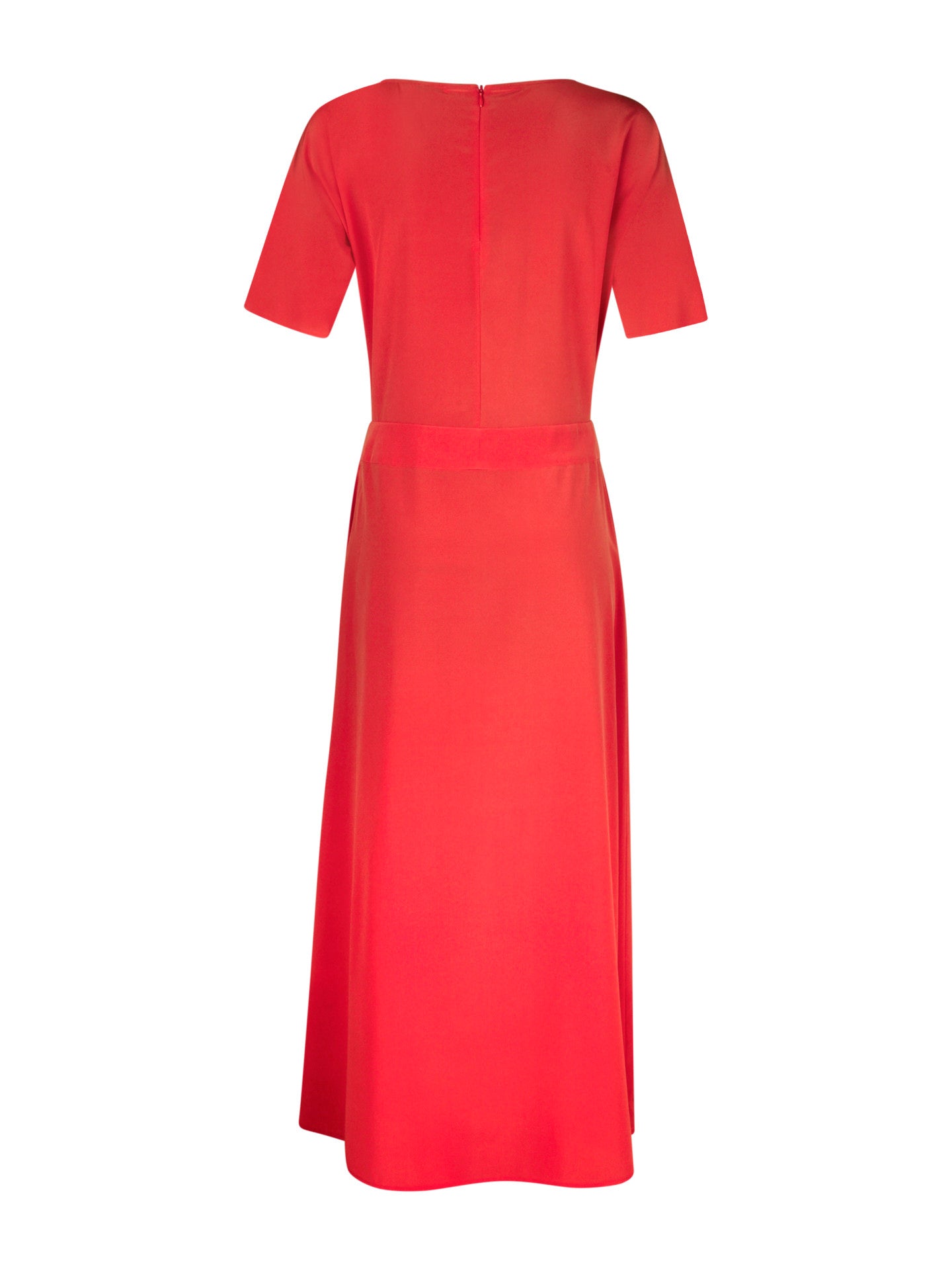 Jessa är en elegant sidenklänning i en klar ljusröd ton med ett mjukt, levande fall. Den draperade vattenfallsringningen ger ett sofistikerat uttryck och skapar rörelse upptill, medan den smala siluetten markerar figuren på ett balanserat sätt. Materialet i 97% silke med en liten andel elastan ger både lyster och komfort. Den släta ytan fångar ljuset subtilt och gör klänningen lika självklar till sommarens tillställningar som till mer formella kvällar. Bär den med minimalistiska accessoarer för ett rent uttryck – eller låt färgen ta huvudrollen.