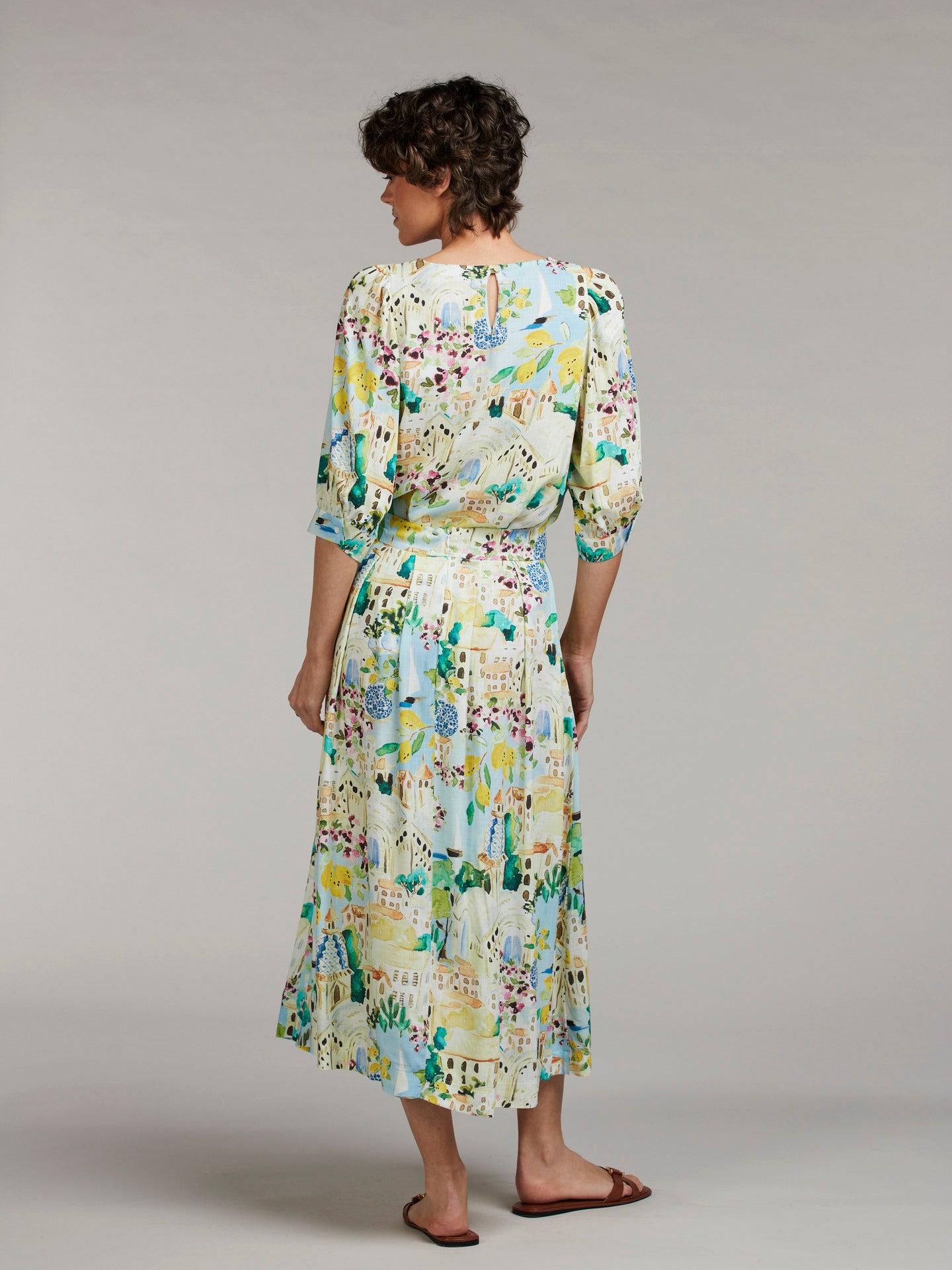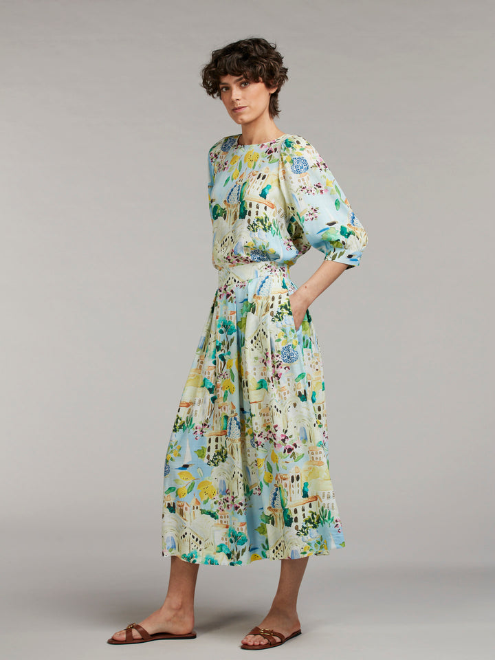 Kathryn är en feminin kjol med ett livfullt mönster och ett elegant fall. Den medellånga längden tillsammans med veck i midjan skapar rörelse och volym, vilket ger ett lätt och luftigt uttryck.
