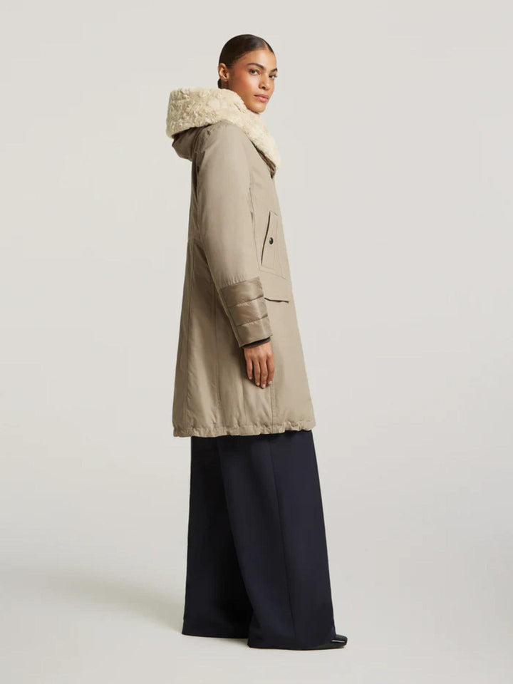 Rhona Coat är en tidlös bomullsparka med Creenstones karakteristiska eleganta silhuett. Den quiltade huvan med sjalkrage, kontrasterande manschetter och avtagbar fuskpälsdetalj skapar en lyxigt arbetad look som fungerar både till vardags och mer dressade tillfällen. Den justerbara dragskon i nederkanten ger möjlighet att forma passformen efter stil och behov, medan tvåvägsdragkedja och praktisk frontslå höjer både funktion och komfort. En mångsidig och sofistikerad parka som håller stilen år efter år.